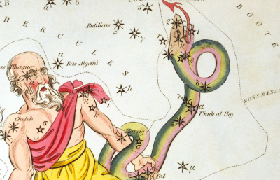 Not far from Virgo is the Serpent, perhaps referenced by the Dragon (a type of serpent according to Strong's Concordance). The Dragon is associated again with the number seven, and The Serpent has 7 prominent stars about its head (notice the double star):