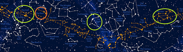 As I looked, behold, a stormy wind came out of the north, and a great cloud, with brightness around it, and fire flashing forth continually, and in the midst of the fire, as it were gleaming metal. And from the midst of it came the likeness of four living creatures. And this was their appearance: they had a human likeness, but each had four faces, and each of them had four wings. ... And the four had their faces and their wings thus: their wings touched one another. Each one of them went straight forward, without turning as they went. As for the likeness of their faces, each had a human face. The four had the face of a lion on the right side, the four had the face of an ox on the left side, and the four had the face of an eagle.The four same human and animal faces. As it happens, the Lion and the Bull also lie on the ecliptic (they are signs of the Zodiac), while the Eagle lies just off it, in ancient Greek astronomy. Perhaps the human face is the Hunter (Orion), just below the Bull: